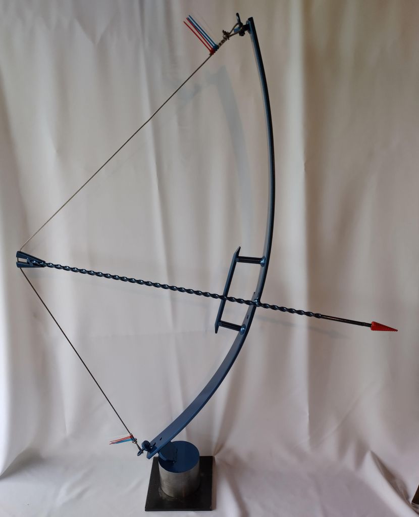 This is a bow and arrow that sits on a 23 pound solid steel base. This piece is beautiful yet strong and heavy would make a great entry way or a beautiful backdrop in an office space.