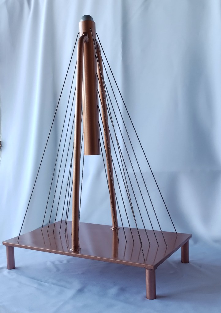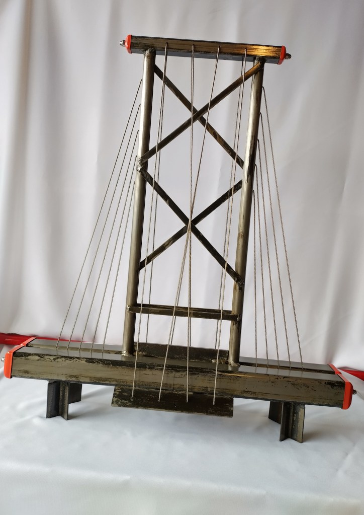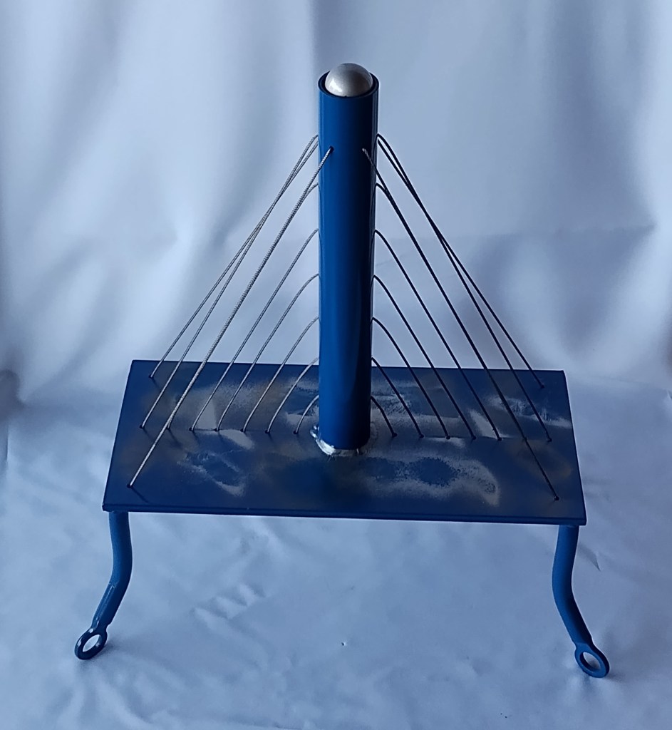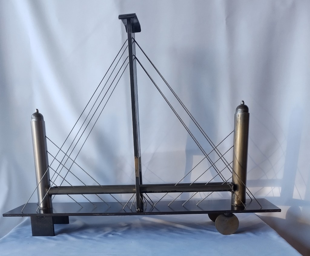 This is a bridge inspired concept. Made of steel and the cables are stainless steel has an automotive clear coat finish