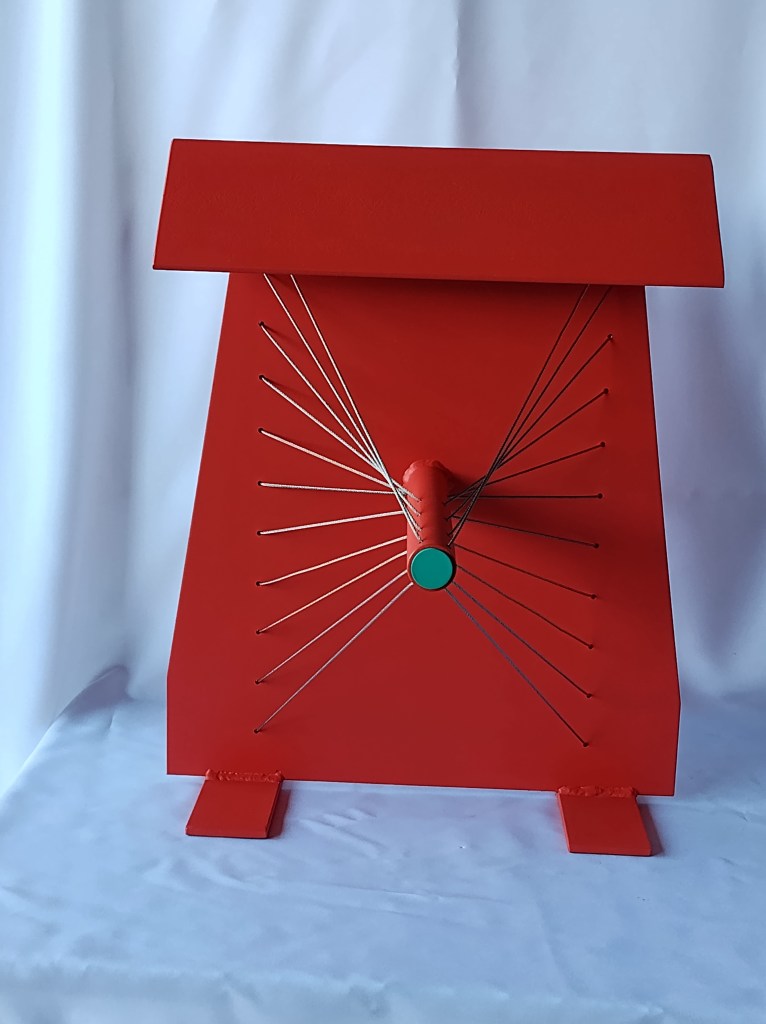 A modern steel art with stainless steel cables and steel base and center post. The legs are 3/4 inch grade 8 solid steel. The paint is a no peel no chip durable Krylon paint. The top of the base plate has a smothered paint finish and the entire piece is covered with an automotive clear coat finish.